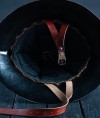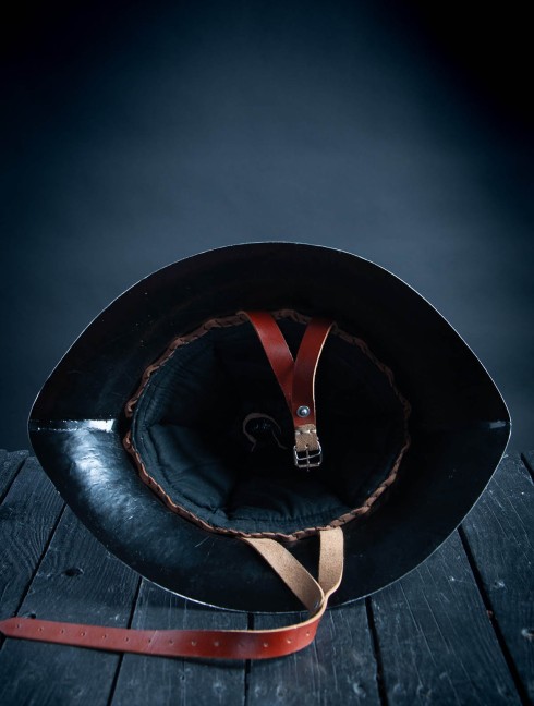 Cabasset helmet for sale, which we bring to your attention, is hammered out of cold-rolled 1.5 mm steel and is kept on the head with leather belts with steel buckles. Extra thick and soft padded liner is riveted inside the helmet with steel rivets. In options, we offer you to choose type of metal finish treatment (by the way, we have a brand new finish treatment in base option – blackened (hammered) polishing ;-)), leather color, metal of buckles and rivets.
