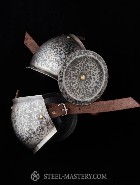 Handcrafted elbow caps with chased rondel is an important element of battle knight outfit. Steel elbow guards was in wide use among knights since the XIV century. Primarily, such caps (also known as couters) were attached to mail sleeve of hauberk, later on they became a part of full arm protection.