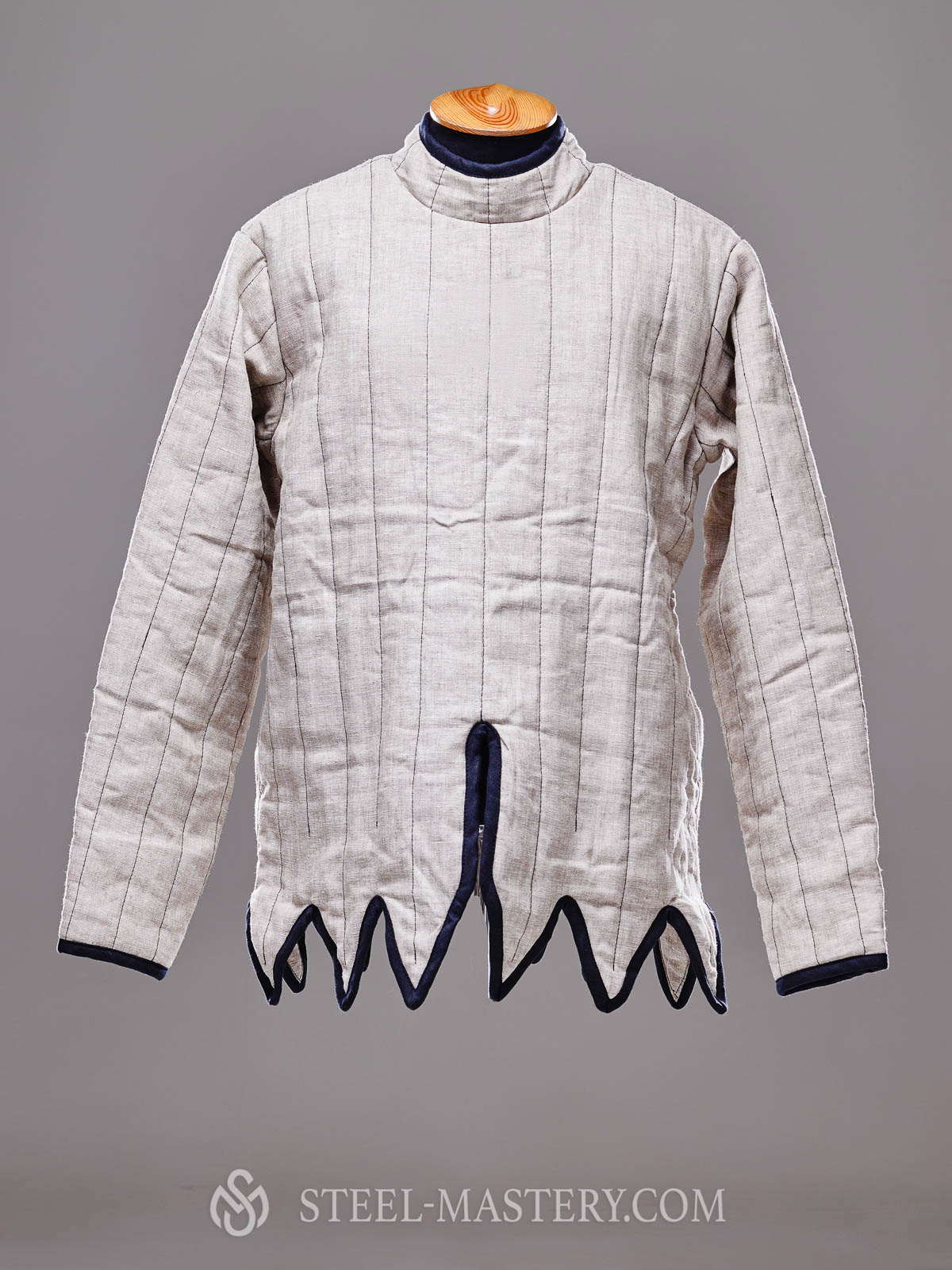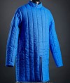 Warriors worn such type of closed-front gambeson under the chain mail, and in this case gambeson coat had 4-6 layers of padding. If you plan to wear it under brigandine or plate armour, so 2 layers of padding will be enough. Gambeson material is also an option to choose. It can be velvet or linen gambison with cotton lining, for example.