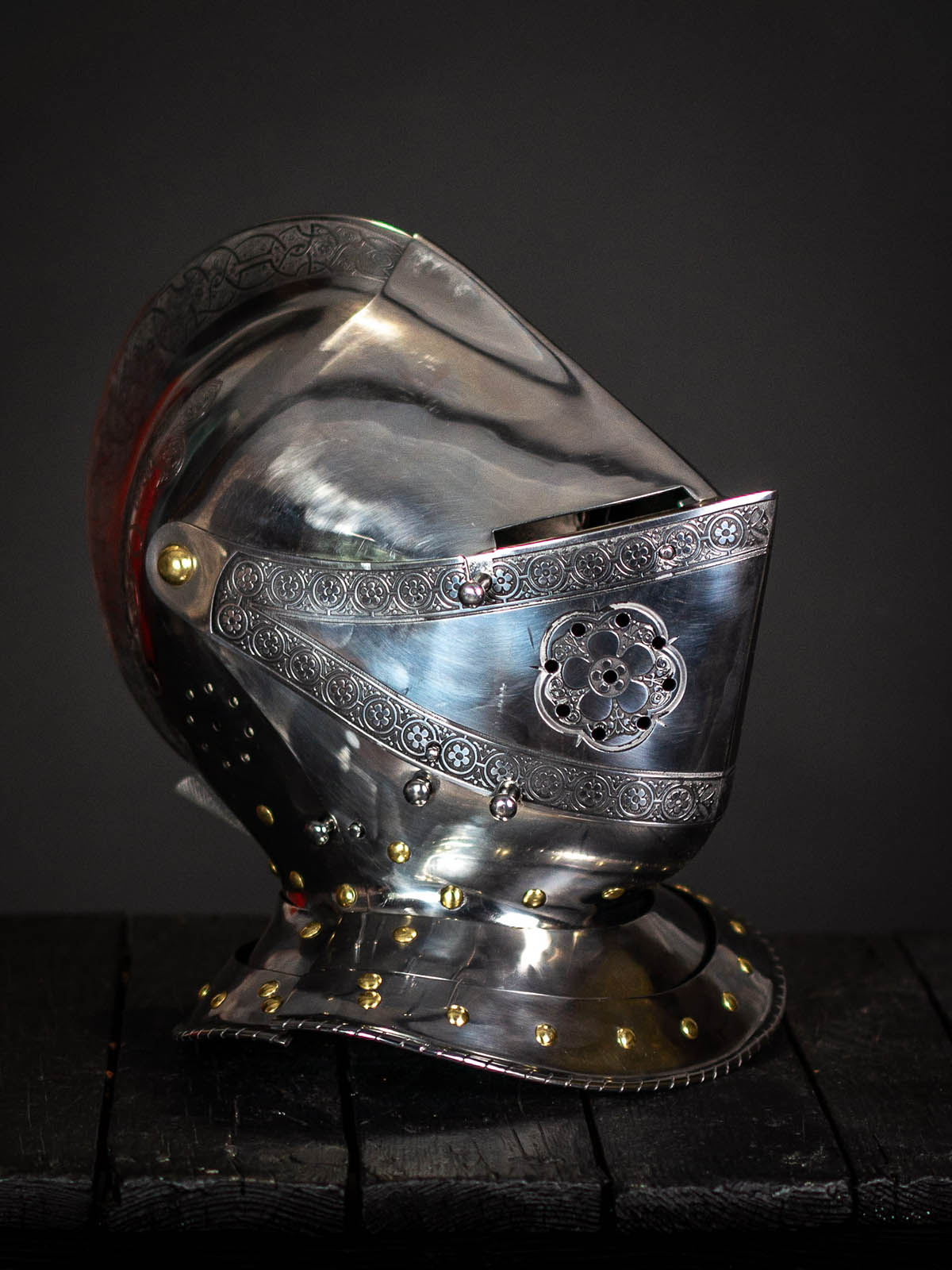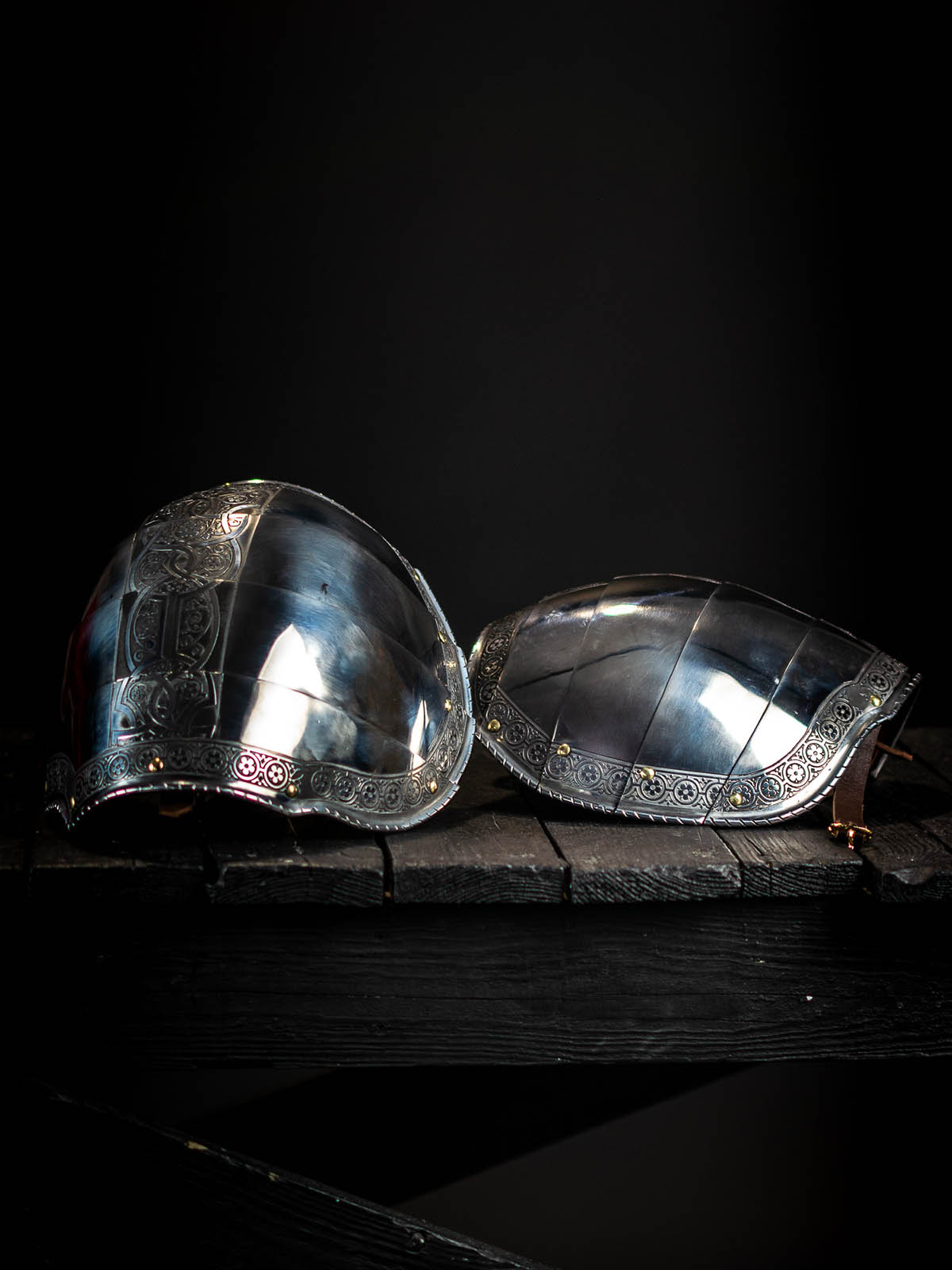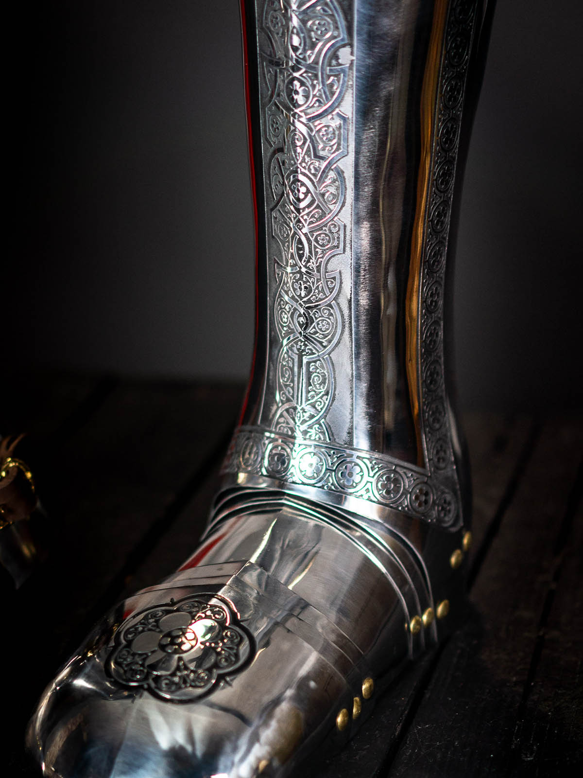 Decoration of medieval battle armor deserves big attention. Elegant etching covers armor with fine floral “Tudor” ornament, which was popular among Greenwich artisans and actual up to now. We did not add gilding, as on the Cumberland armor, striving to create a replica with a hint of individuality. Steel Mastery’s blacksmiths are ready to make any pattern by customer wish, just like other type of decoration, which you would like to see on your Cumberland armor. Please pay attention, that this kind of adornment is not included to the base configuration. However, option “Decoration” was made especially for the fulfillment of your fantasies :)