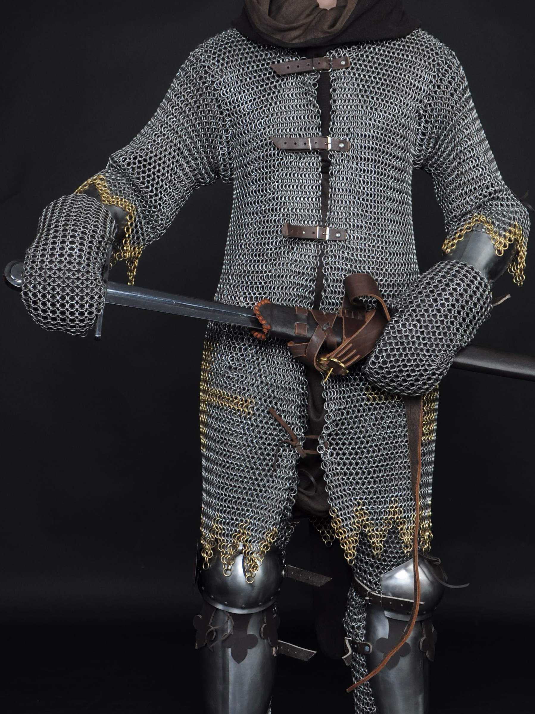There are leather belts with steel buckles from the front of hauberk for fastening.
