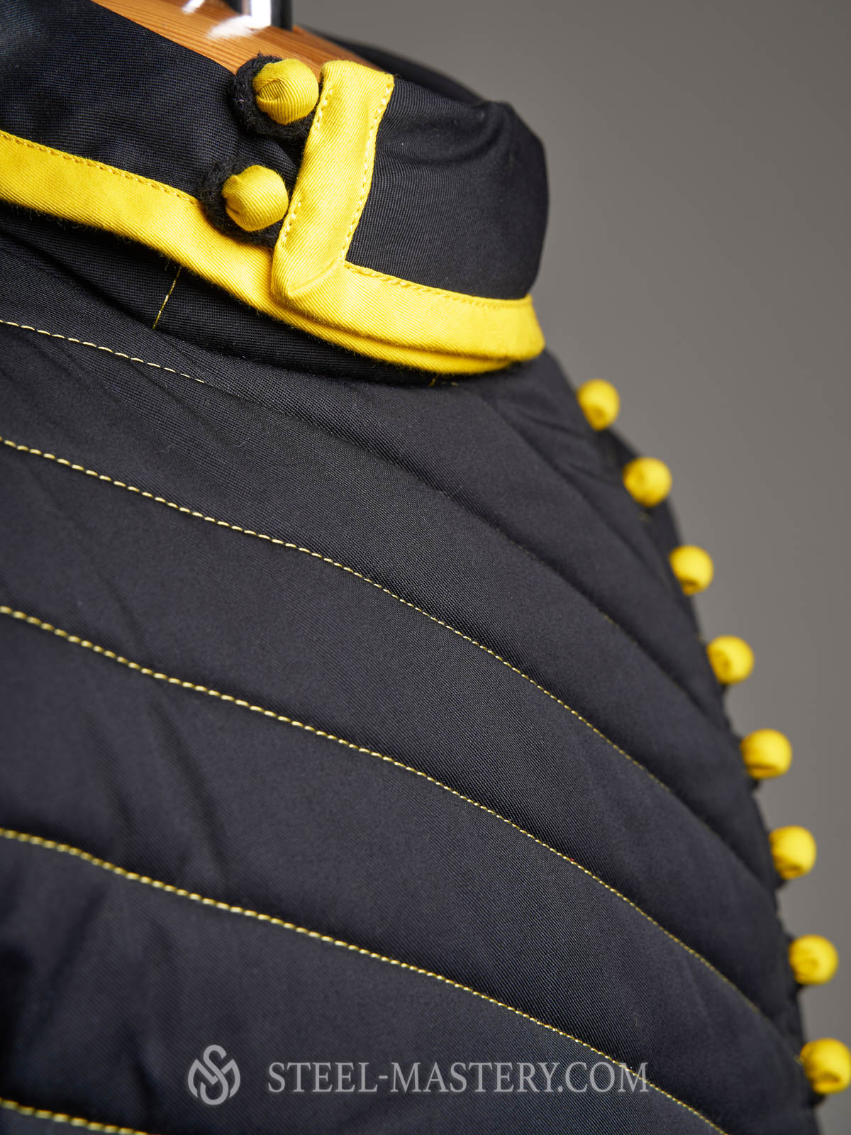 This padded HEMA gambeson inspired by classic fencing camisole silhouette has high stand-up turn-down collar and traditional chest overlapping.