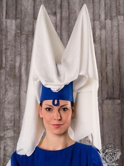 Hennin is the most popular women’s Burgundian headwear of the XV century. It has shape of cone (often, truncated cone), and was made of strong fabric or on frame of whalebone. Base was covered with expensive fabrics and decorated with gems. Silk or batist veil was fixed over it.