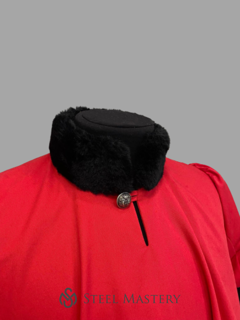The example of Burgundian men's coat, called houpellande. The garb has stand-up collar, puffed sleeves with cuts.