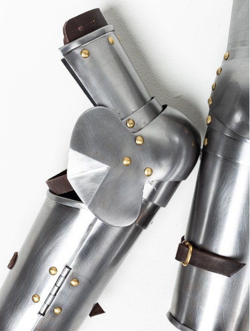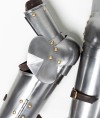 These elements are connected with rivets and have leather belts and buckles for holding of armor on the arm. Tubular bracers have hinges and completely cover forearm of knight. Winged fans on the caps cover outer side of elbow.