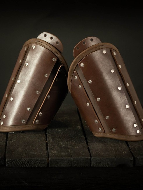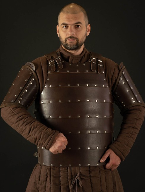 Cold-rolled steel plates of 1.0 mm are riveted from the inner side of matted firm leather. Additional leather strips are riveted from the outer side. Leather straps overlap meeting point of plates to increase protective qualities of this medieval leather armor, not leaving your enemy a single chance to reach your bicep!