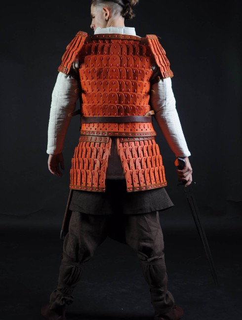 We shortened skirt-tasses of this leather lamellar armor, so unmounted warrior could fight comfortably. However, if you have a flock of hot-tempered horses, so our artisans will gladly make tasses for mounted warrior.