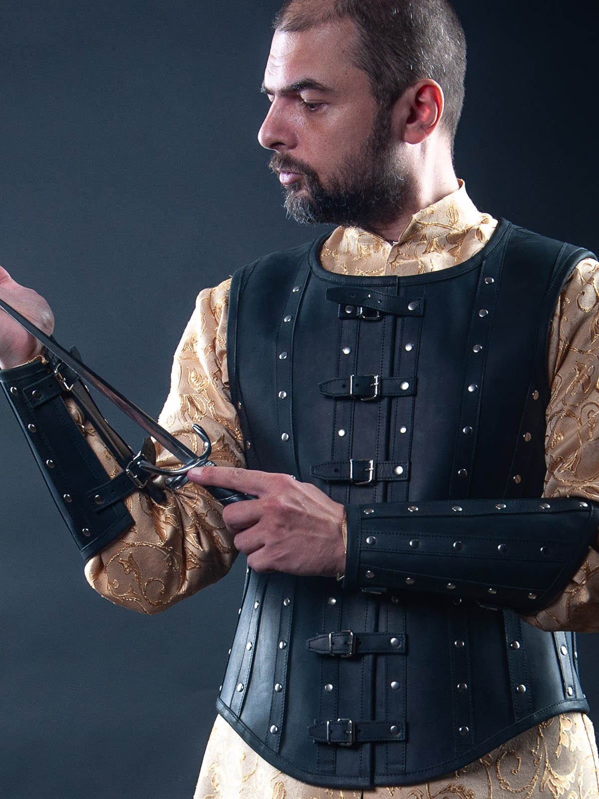 Just for that delicate pursuit of the noble Dons, Steel Mastery made this leather armor costume. Linen is too plain material, cotton is too soft, wool is too comfortable, silk is too sensitive and steel is too rough for such delicate issue. So, only leather, chaste black leather with plain drops of steel rivets is appropriate for medieval leather vest, in which one decides a point of honour.