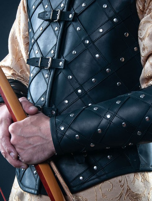 The best armorers of Steel Mastery have made precisely this leather costume. Inspired as by ancient gravures of the medieval knights, so by modern pictures of fantasy warriors, after long meetings, debates and fights, our masters reached conclusion and created perfectly sustainable medieval leather vest, appropriate as for historical event, so for fantasy-style festival with bracers in same style.