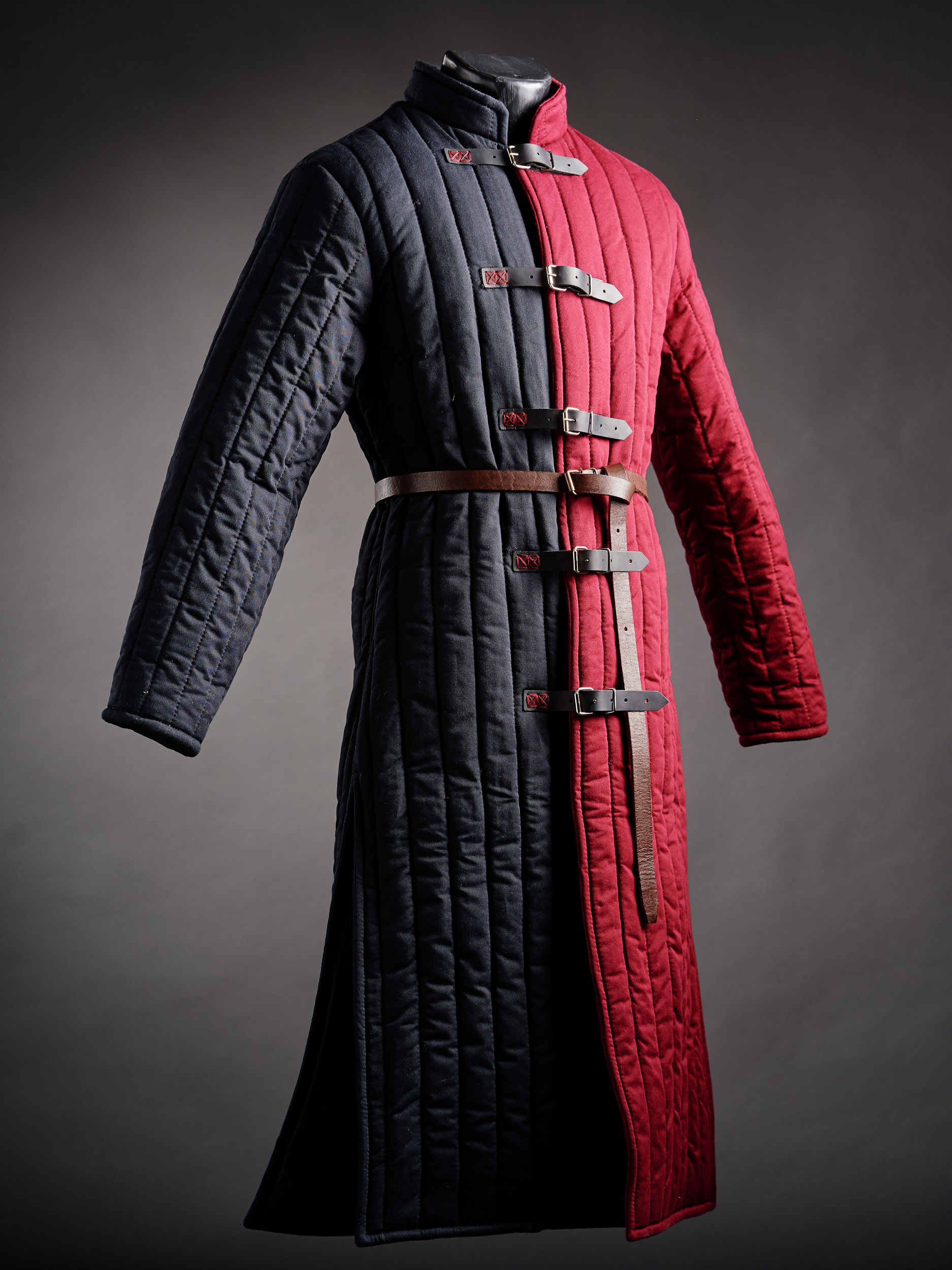 Outer material of gambeson armor always showed social status and financial health of owner. So, poor soldiers were wearing linen or cotton gambeson. Rich and noble knight could afford silk, wool or leather gambeson. Various types of fastening were used as well: leather belts with cast buckles, metal buttons, straps with steel or brass points. Bottom edge could be decorated with festoons.
