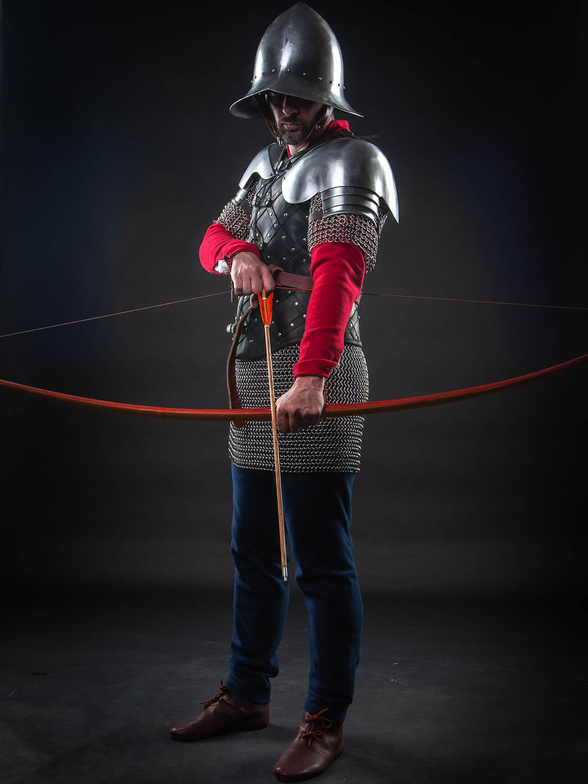 This man – English archer – wore plate spaulders. This cool guy’s outfit wasn’t that fashionable in the capital, however, trendy in Surrey. Simple chain mail, almost like this one (only a little bit shorter plus made of stainless steel), worn under the leather jack, and cabasset on the head. But the most interesting armor part was the shoulder blades that he got as a trophy from the fallen knight (do not ask how this happened, believe me – you don’t want to know).