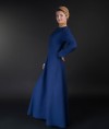 There is a chaste long Middle Ages dress with long straight sleeves, plain boat neckline and wide belt, which emphasizes design and adds majesty and elegance.