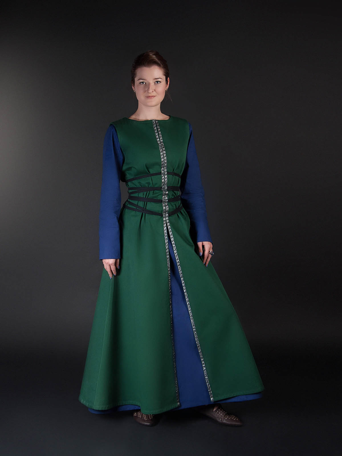 Here medieval style dress “Retenue” is as decent as herself: chaste long blue medieval dress with long narrow sleeves and plain boat neckline and deep-green sleeveless mantle, worn over the dress. Mantle has quite simple cut, but it is splendid at the same time. Strong fabric is pleated with thin decorative black laces on the waist level. Panel fronts are decorated with dark silver trimming, which does not create an effect of slangy luxe, but delicately highlight status of medieval queen dress wearer.