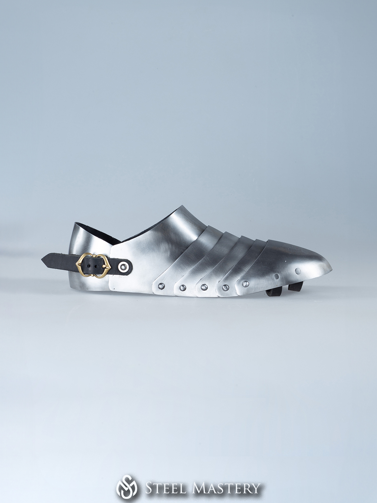Based on the the Royal Collection, Leeds, England. Our blacksmith recreated the exact shape of historical sabatons. It has seven plates constructed to follow the foot shape. The heel plate is articulated and hinged on the inner side, while it fastens with a strap on the outer side.
