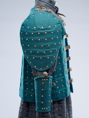 Various fastenings and types of decoration are available for order. We can make an embroidery of your heraldic emblem on the brigandine, or decorate the bottom edge with fancy festoons. Brigandine or whole-hammered spaulders provide with additional protection.