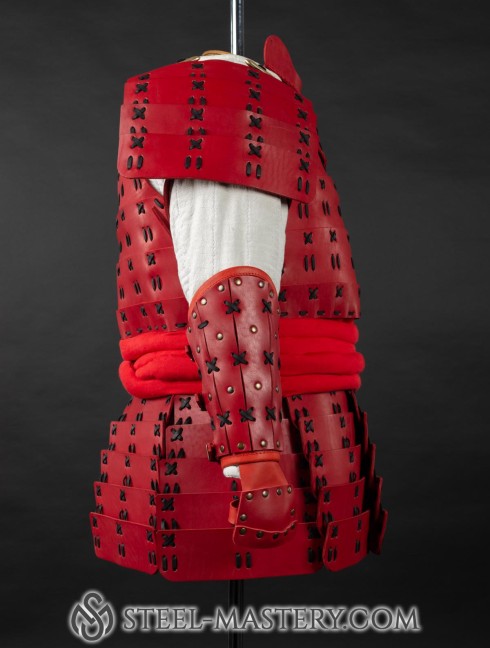 So, make yourself comfortable and have a look at this armored good-looker in front of you! Though, it is modest enough, this true son of the Land of the Rising Sun is steeped in Buddhist humility, hardened by spirit of bellicose warrior monks sōhei and is perfect even in details. From the splendid black leather, equally modest and striking, to the bright and firm cord of the noble and manly scarlet color, with which armor’s parts are fastened together. However, you may choose other colours of leather and cord by your wish.