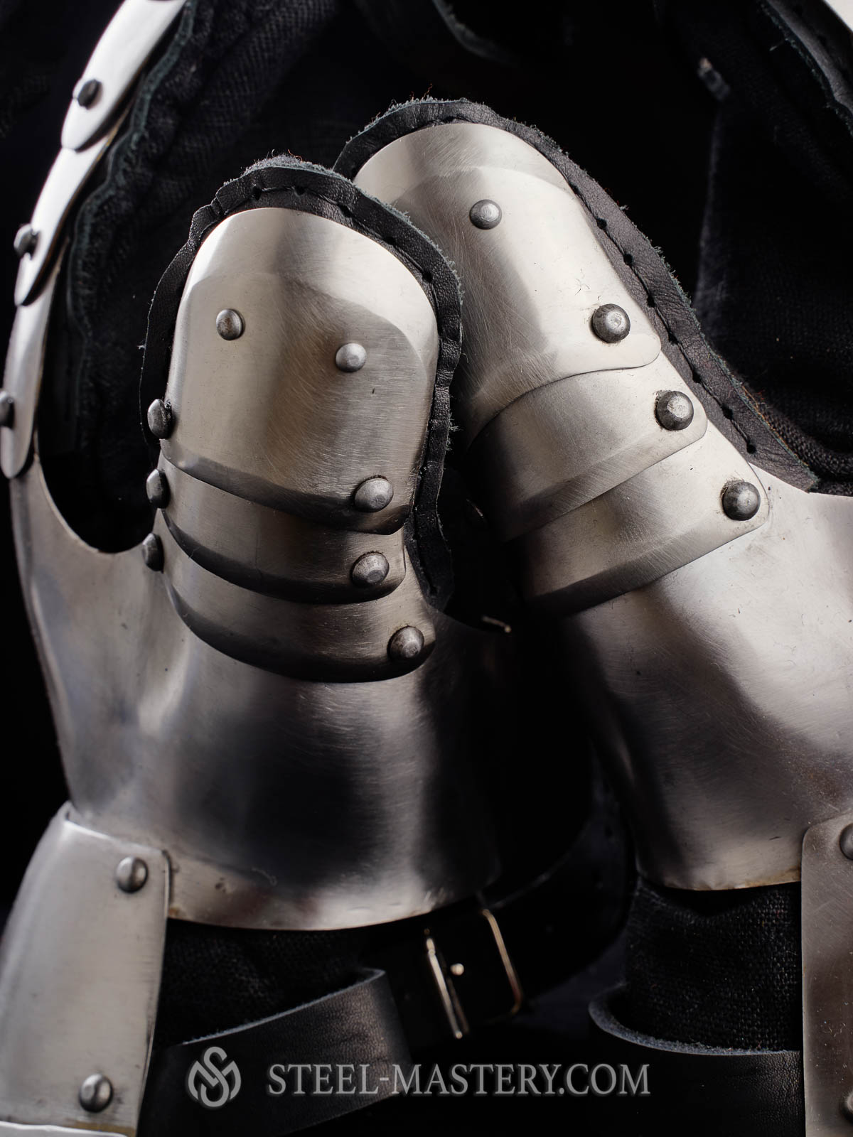 Wide metal plates allow good and firm hold of weapon without worrying about hands’ safety. Firm and soft croupon leather, belts with steel buckles, thick padded cotton mittens from the inside – that is how modern metal armor looks like.