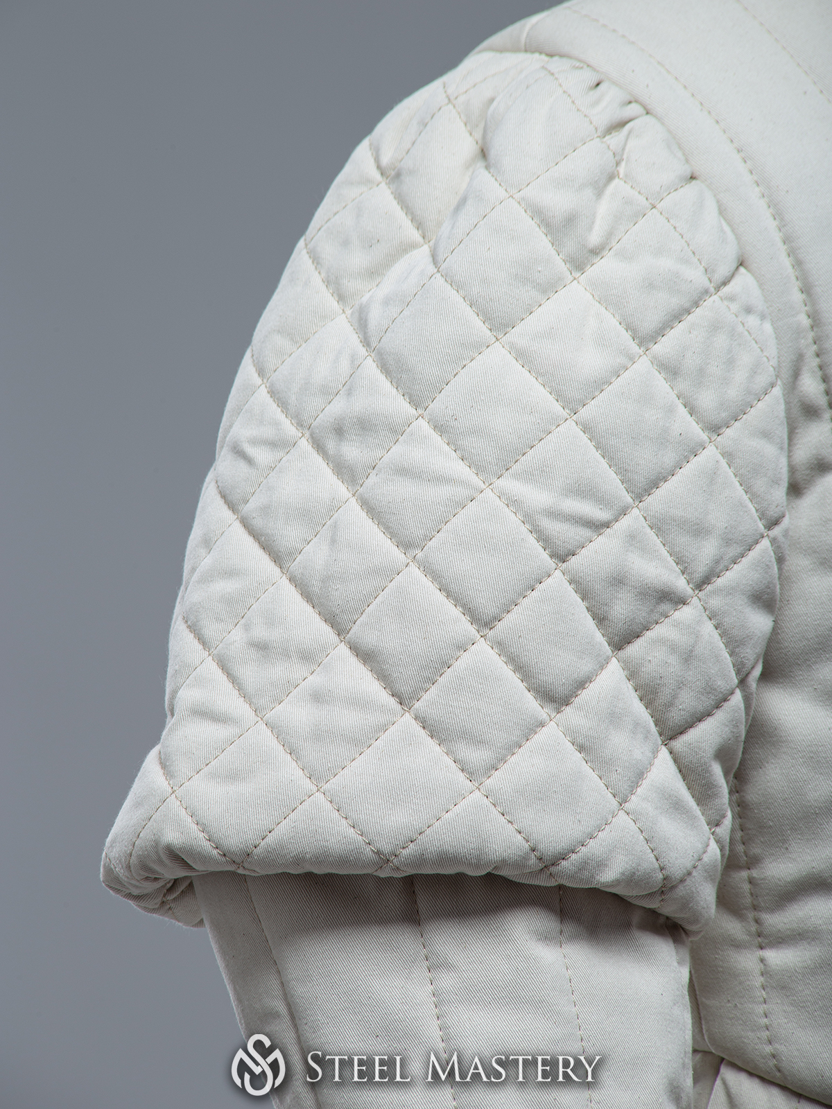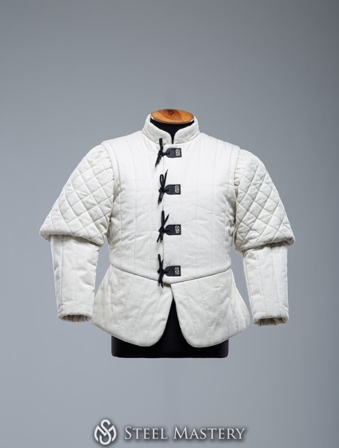 So, by choosing what piece may we offer you from the men’s wardrobe of the middle of the XV century, we could not leave out a farsetto. After analyzing of the existing graphical sources and descriptions, Steel Mastery crafters took the best from the each and recreated the generalized look of the perfect arming doublet – farsetto, which is appropriate in any corners of XV century Europe. Short tight silhouette, narrow sleeves with puffs, short and tough collar. We decided to fasten men’s doublet farsetto with light brown leather belts with stylish cast buckles of golden color. However, by your regards, we may replace them with buttons or leather laces. This classy padded doublet is decorated with vertical stitching and puffs – with contrast diamond-shaped stitching.