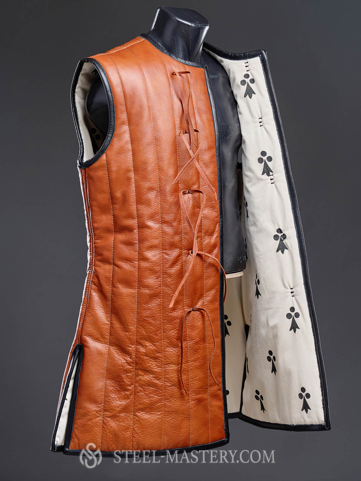 There are various materials are available for such padded vest. As fabric of gambeson was showing social status of owner, you may choose velvet, wool, leather or more simple linen or cotton. Bottom edge can be decorated with festoons.