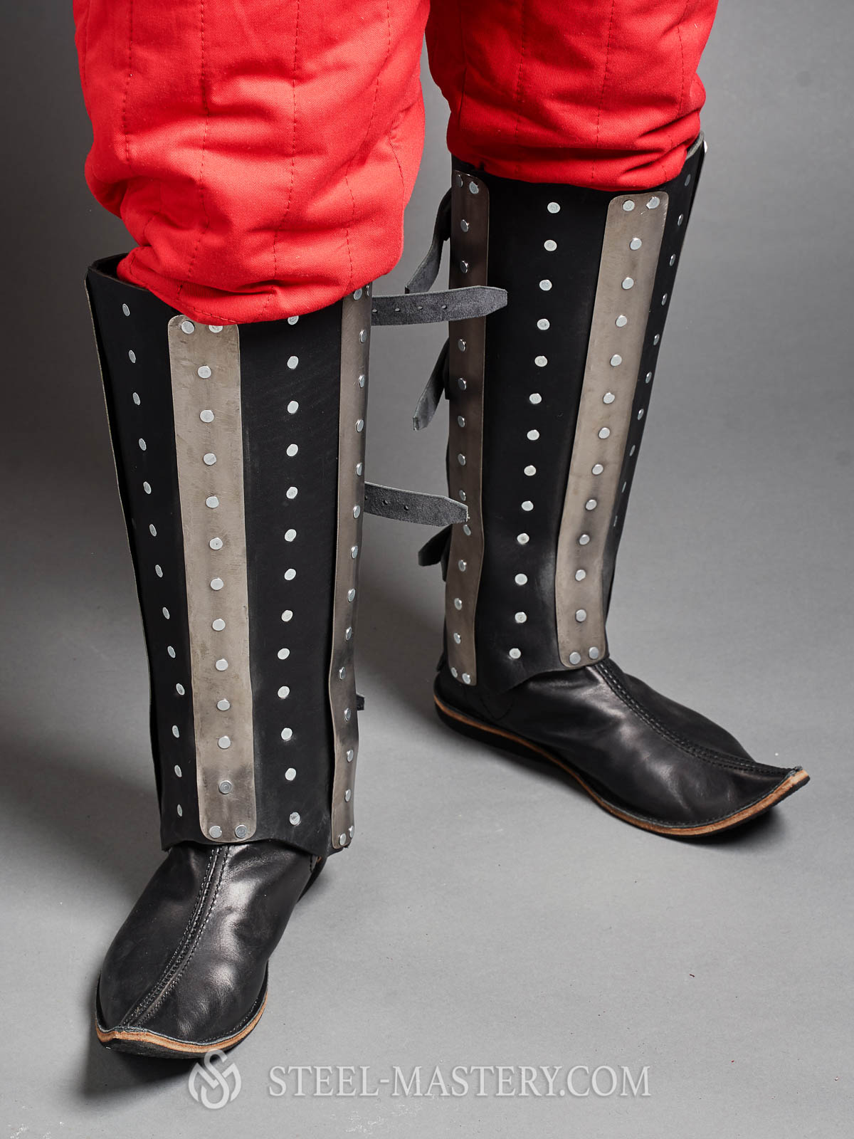 We use firm croupon leather of thickness 3.5-4 mm and high-quality metal (cold-rolled or stainless steel or titanium, by your choice). Medieval splinted greaves are held on the calf with three leather belts and buckles.