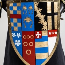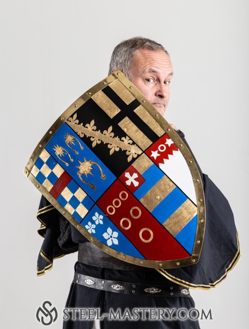 Steel shield is a model of medieval knight defense, more known as triangle or heater shield. Medieval armor of similar shape and different sizes were in wide use by infantry and cavalry starting the XII century. There are many historical sources, where you can see images of heater shield.
