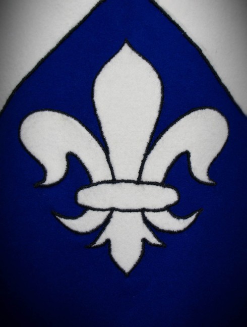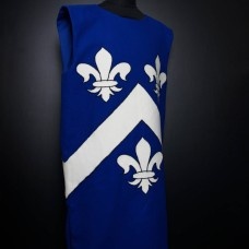 Silver and azure of this medieval tabard symbolize noblesse and generousness. Partition with chevron means protection of weaklings and striving forward. Three royal lilacs – Fleur-De-Lis – go up to devotion of Virgin Mary and hint at affiliation with royalty. That is a custom tabard with various undermeanings.