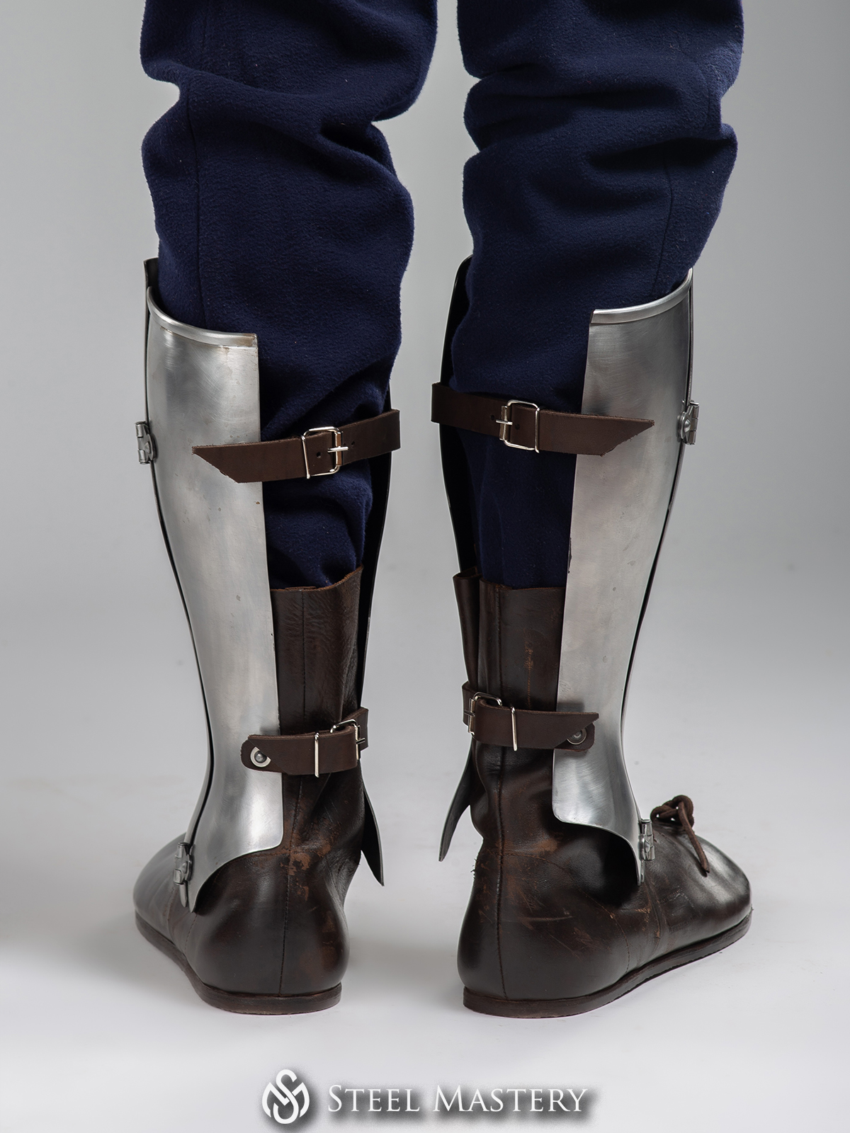 Greaves have hinges on the outer side and leather belts with buckles for fastening installed on the inner part of plate leg armor.