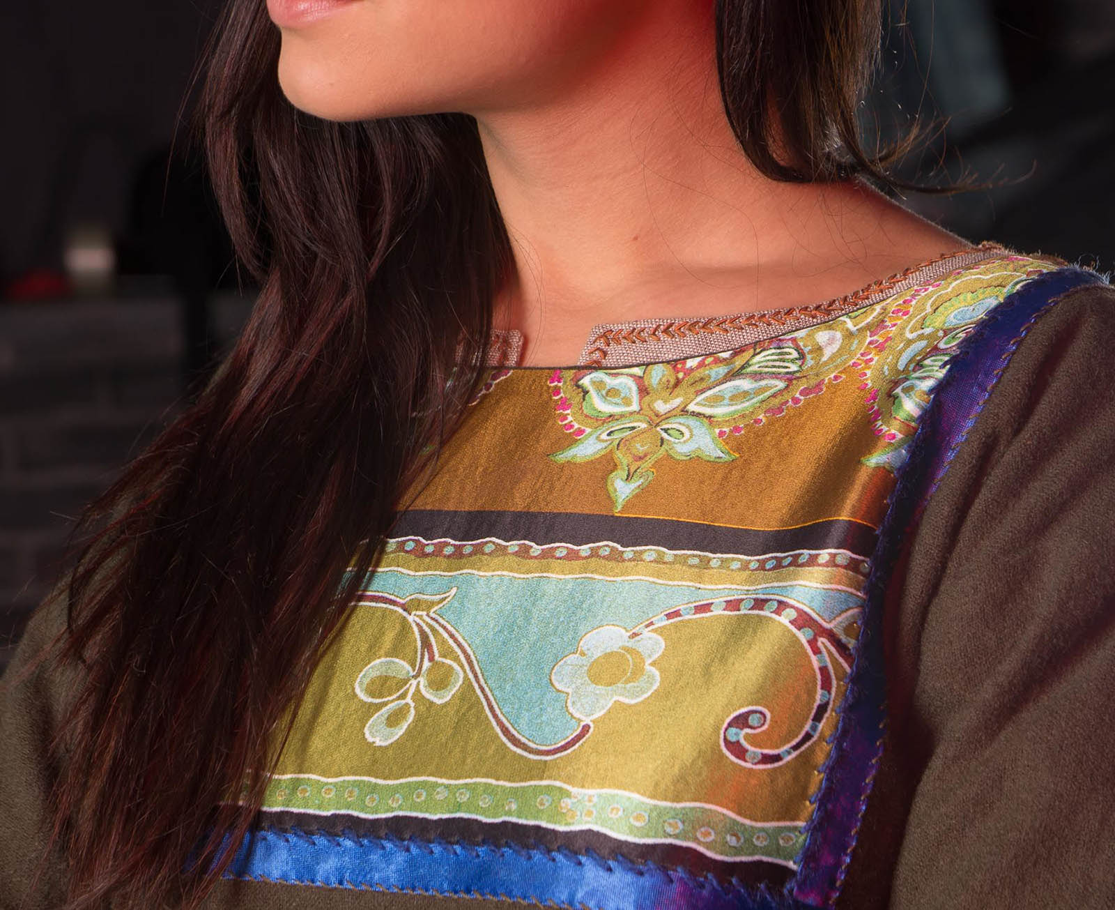 Undershirt (medieval chemise) is made of linen and decorated with hand-made embroidery around neckline and cuffs.