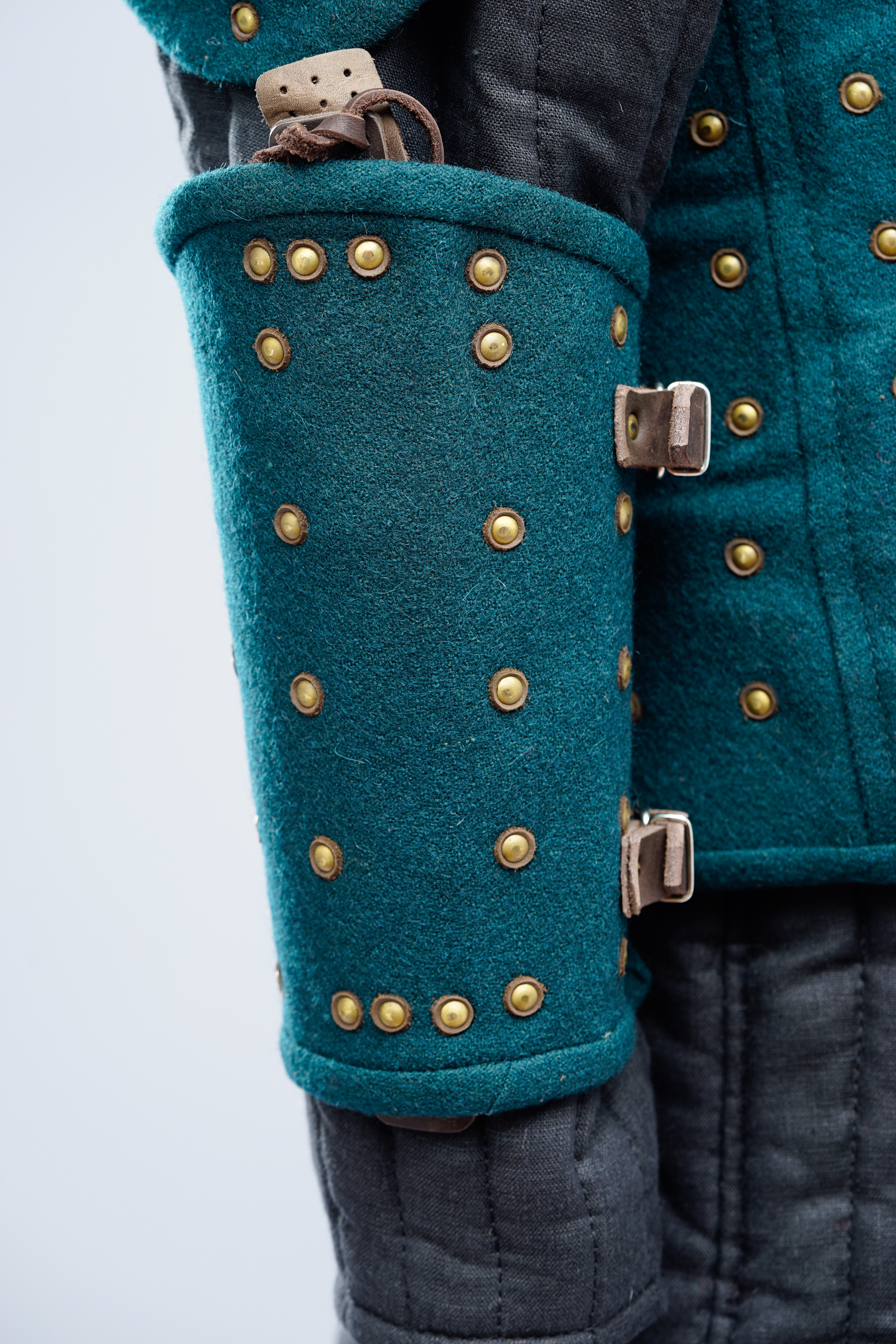 Woolen medieval bracers are fixed on the forearm with high-quality leather straps and buckles.