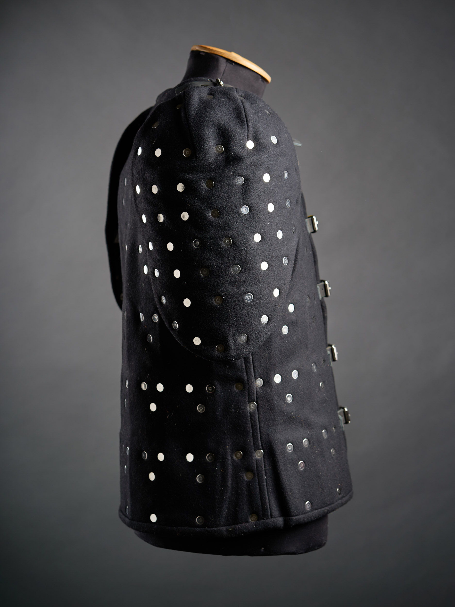 Made-to-measure brigandine is completely handcrafted. Fastenings from the front and on the shoulders allow easy and comfortable wearing of brigandine without external assistance.