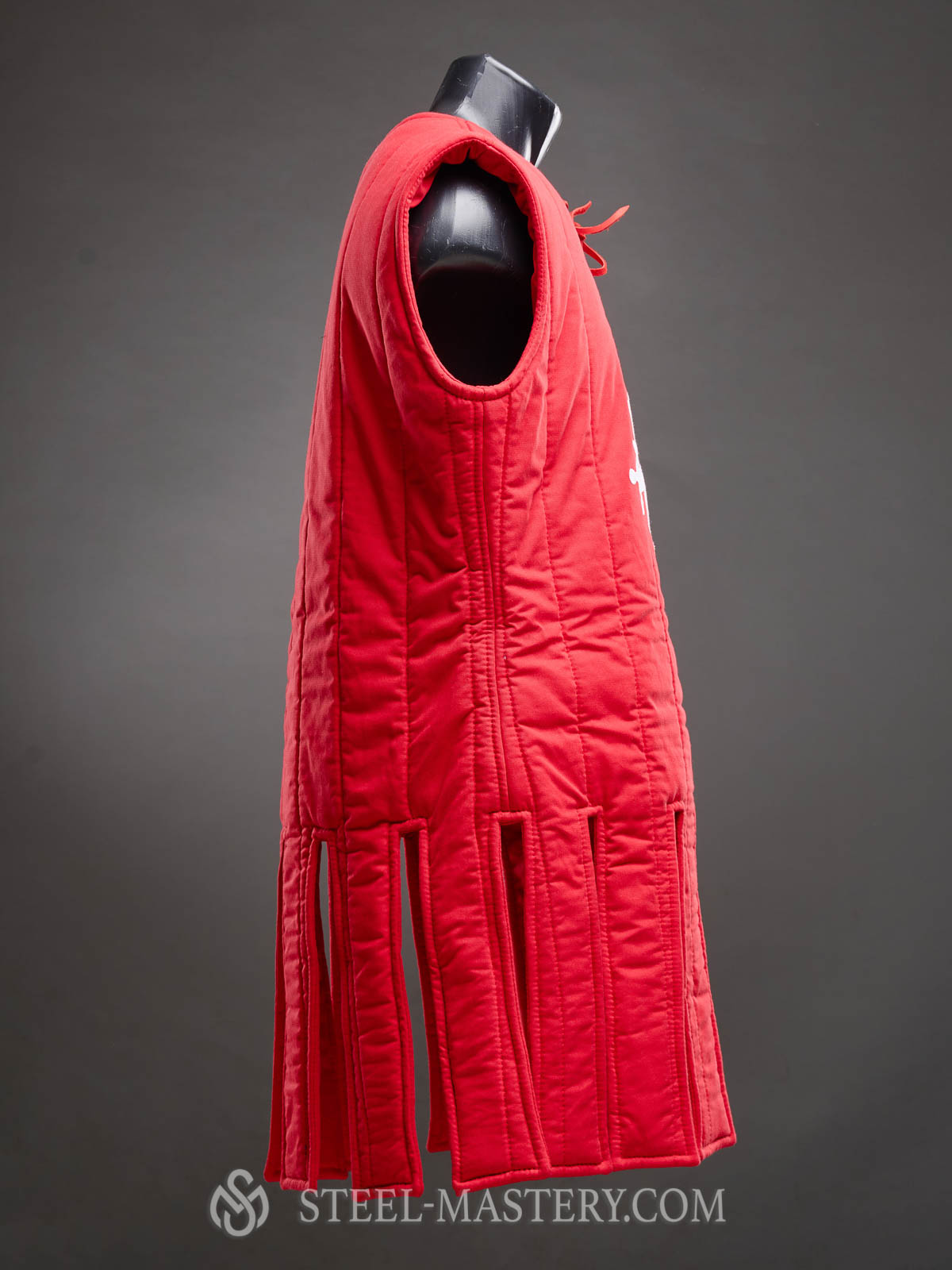 Gambeson with festoons on the edge was being used by archers or warriors, who did not take a participation in combats. It can be worn over the chainmail or under it. Leather string on the neckline is used for fastening.