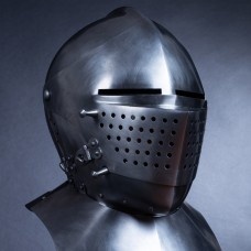 Medieval helmet armet takes its origin in XV century, being designed - as presumed - in Italy. It was distinguished by being the first helmet of this time to protect completely the head, compact and light enough to be carried one. Movable hinged cheek pieces and gorget plate opened backward show the face.