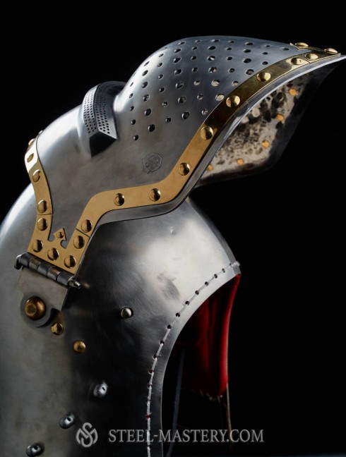 This model was typical for 1350-1410 years. The striking feature of this type of Bascinet is double-point fix on the both side of helmet. Mobile visor with single ocular is allowing great visibility and safety. Holes in visor provides with good ventilation.