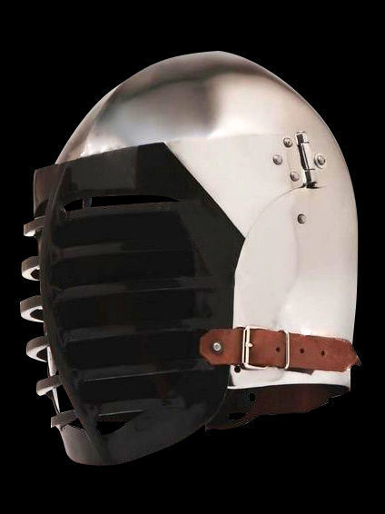 You may also like these models of helms with bar grid: bascinet with side hinged bar visor, bascinet with face grill, Phrygian helm with bar grid and full neck protection.