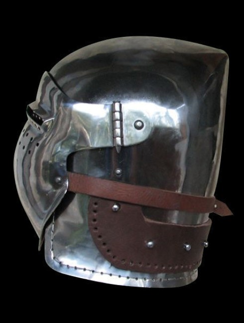 Bascinet is a type of medieval head protection, which replaced the Great Helms in the middle of the XIII century. Such helms gained popularity very fast among knighthood due to its comfortable and functional design. This model with side hinged mobile visor was mostly popular in the XIV-XV centuries.