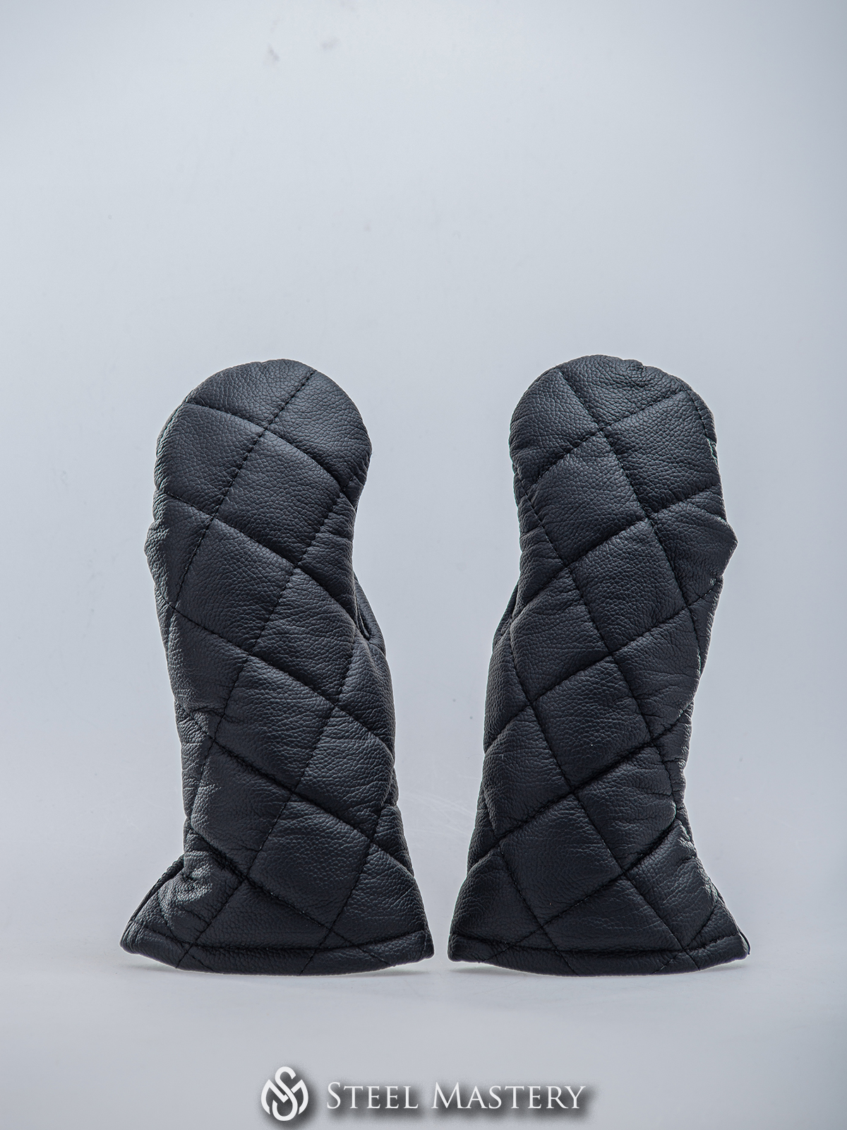 BLACK LEATHER MITTENS WITH DIAMOND STITCHING IN STOCK