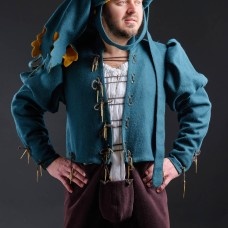 The doublet has a low stand collar, lush gigot sleeves with biceps buffs and lacing at the wrists. The hem, which emphasizes the waist, is equipped with laces to fasten the chausses.