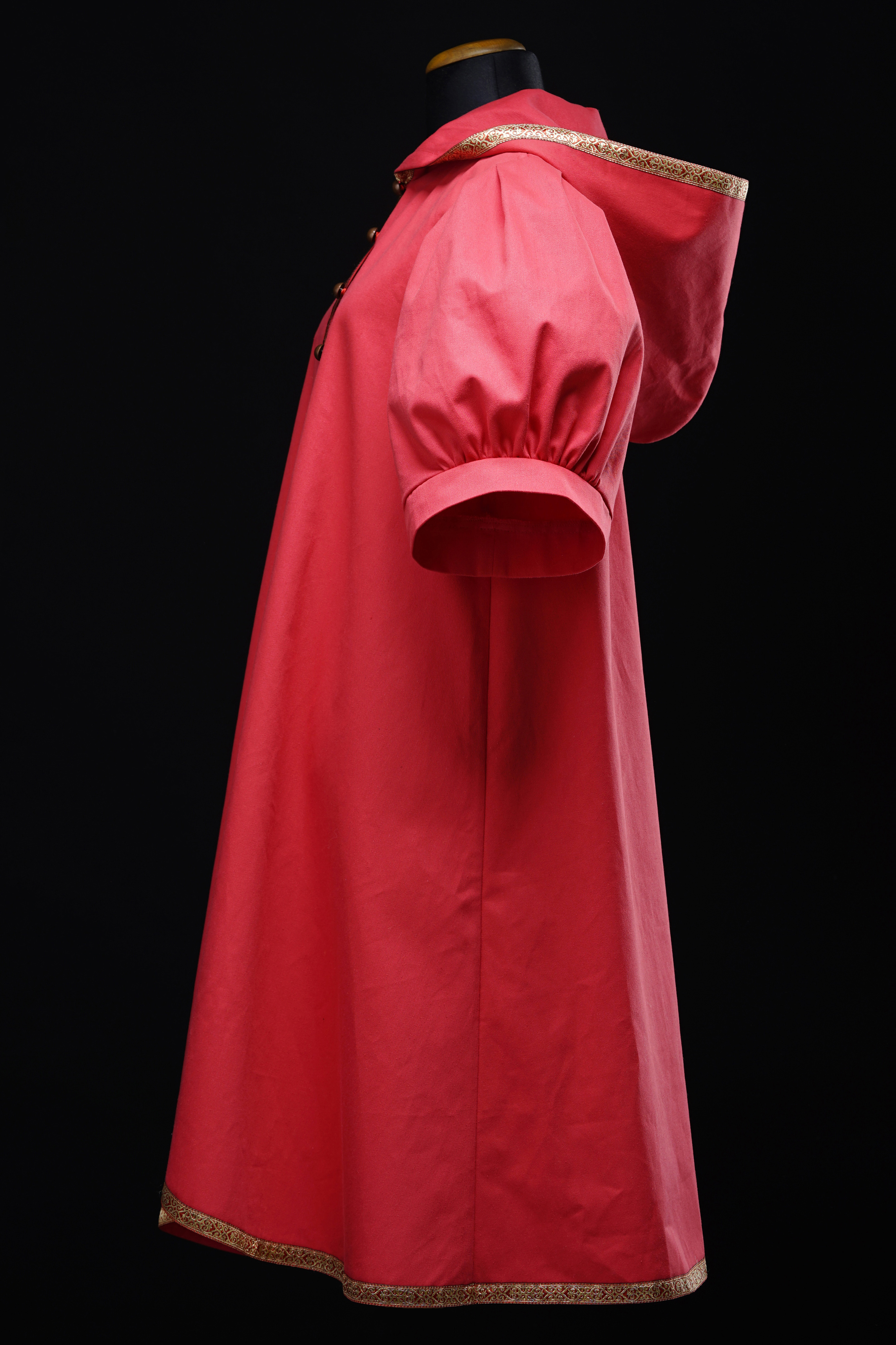 To create a gentle look model has elegant hood and short puffed sleeves. It is decorated with beautiful trim and is fastened with 7 metal buttons. Buttons can be made of brass or covered with fabric as well.