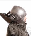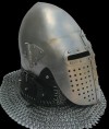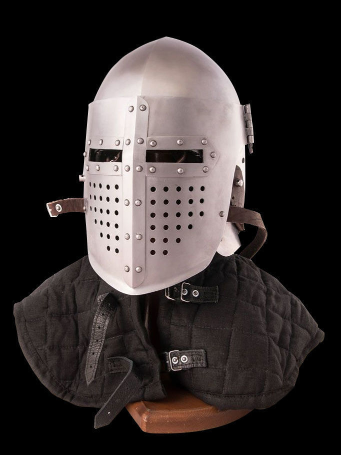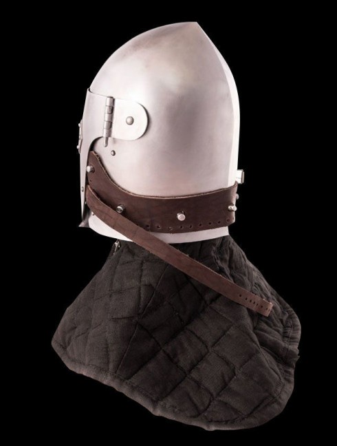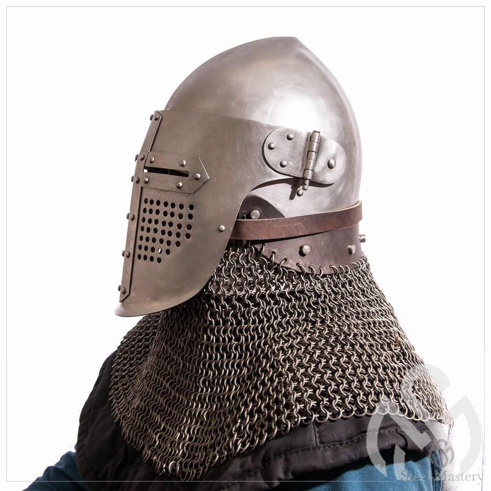 Medieval battle helmet of type bascinet was widespread among European knights in the XIV-XV centuries. This functional armor had dozens of dome and visor designs, depending on the region of using. Knights were usually completed bascinet with padded pelerine and mail aventail. That way, neck, throat, shoulders and upper part of chest were covered and well protected.