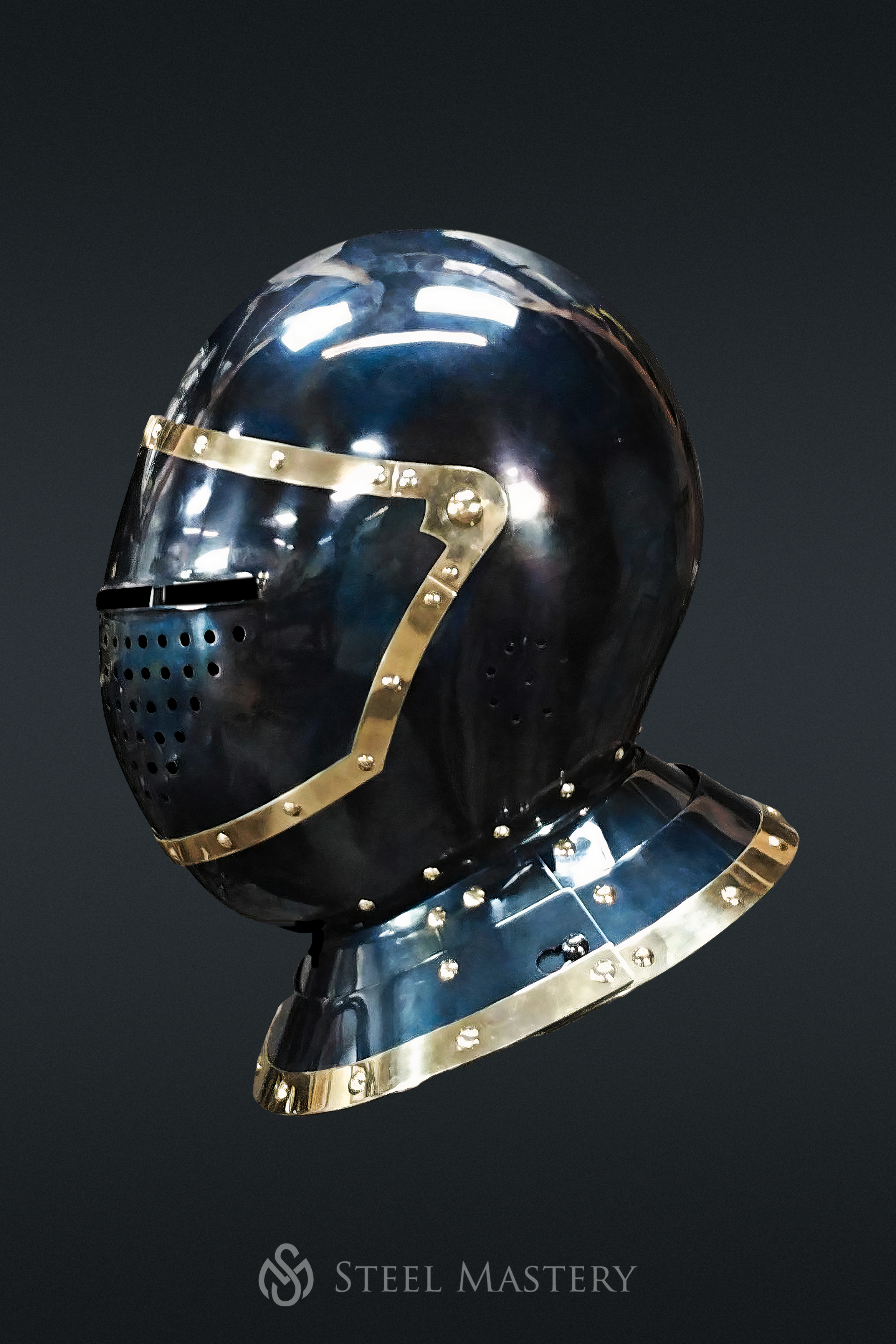 Closed medieval helmet armet was in wide use among European knights in the XV-XVI century. This battle helm provided with complete protection of face as well as neck and throat. In distinction with other models of head armor, armet had not round ventilation holes, but narrow cuts on visor.