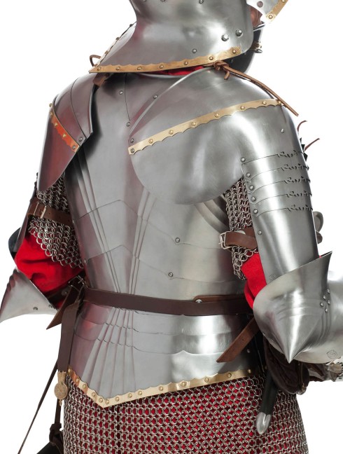 Ribs and sharp shapes are typical for German armor in Gothic style of these times, being its distinguishing decor and coolest part. Such type of decoration was not just the fashion features, but helps to override direct blow and change sliding path of weapon. Moreover, goffer decoration allows you to significantly increase the strength and durability of the armor, without overweighting it.
