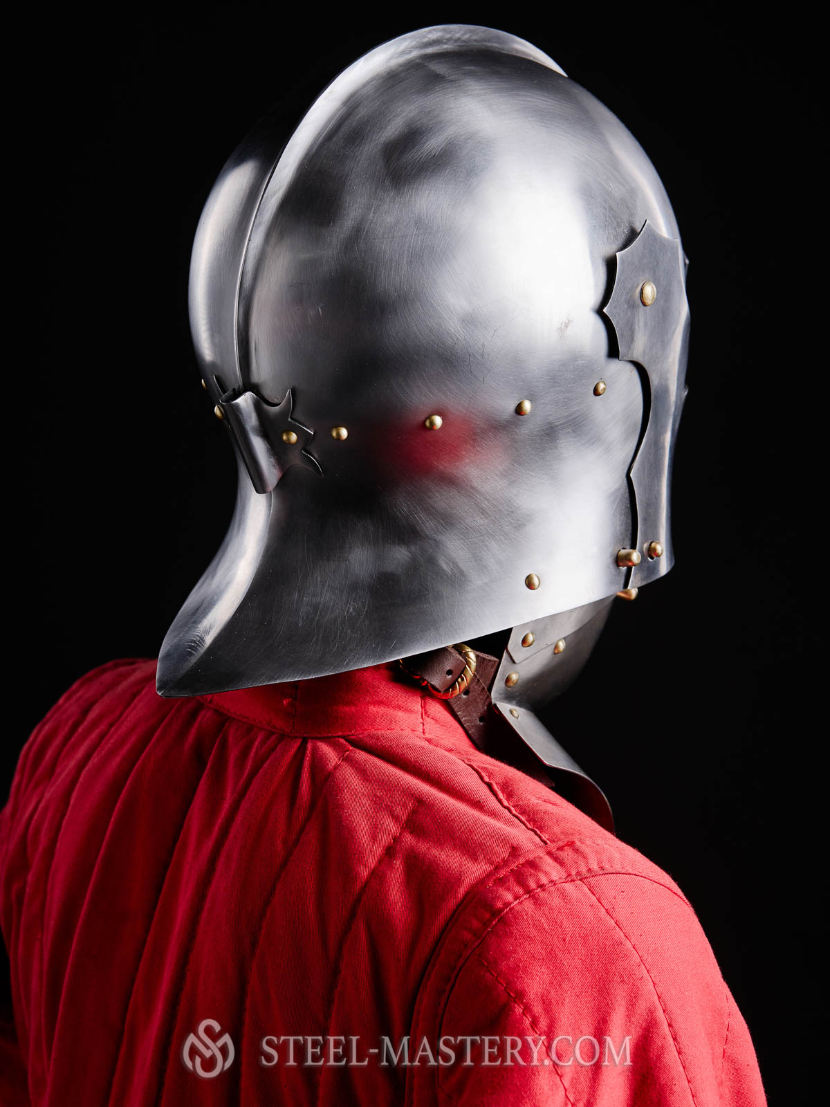 Medieval helm sallet (salad) appeared in the medieval Italy and completely replaced bascinets. This head protection was high-demanded among as noble warriors, so common infantry and archers. But the most popularity, sallets gained in Germany. Sallet with movable visor became a main element of well-known full-plate Gothic armor. These helmets were often decorated with top figures or chased elements.
