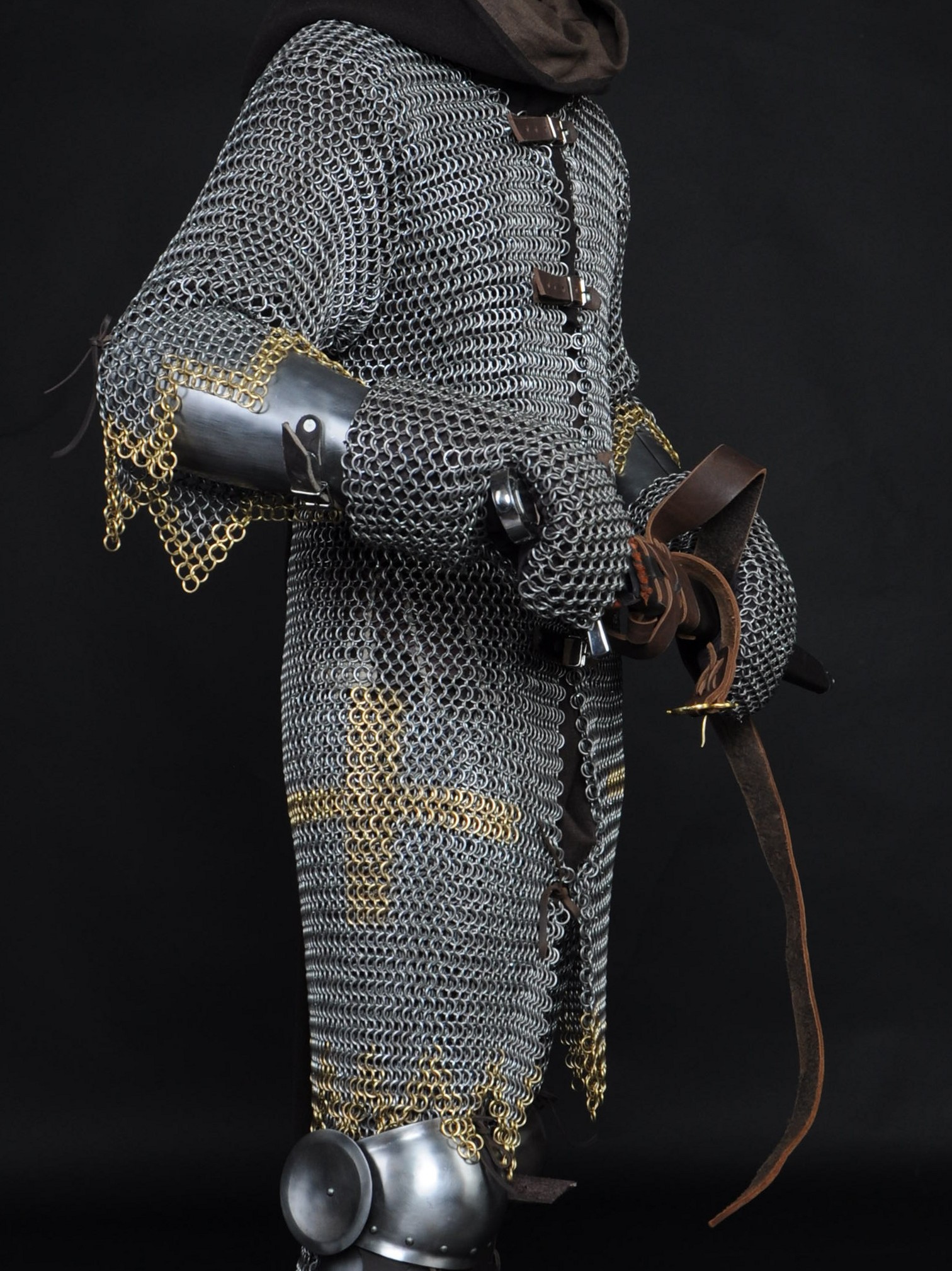 Such type of armour as hauberk is a chainmail with mittens and coif, that were often being worn separately. It was very popular armour till the XIV century, but then was displaced by brigandine and plate armours.