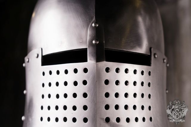 Presented closed knight helmet is an evolution of medieval head protection topfhelm.