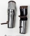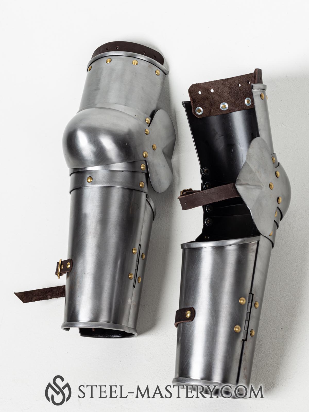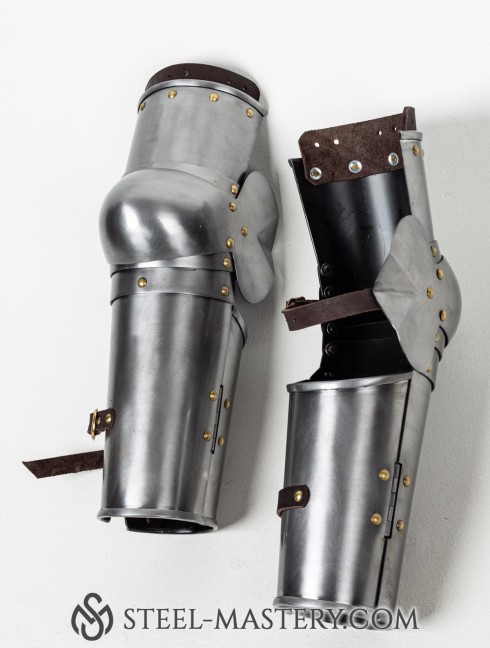 These elements are connected with rivets and have leather belts and buckles for holding of armor on the arm. Tubular bracers have hinges and completely cover forearm of knight. Winged fans on the caps cover outer side of elbow.