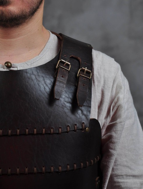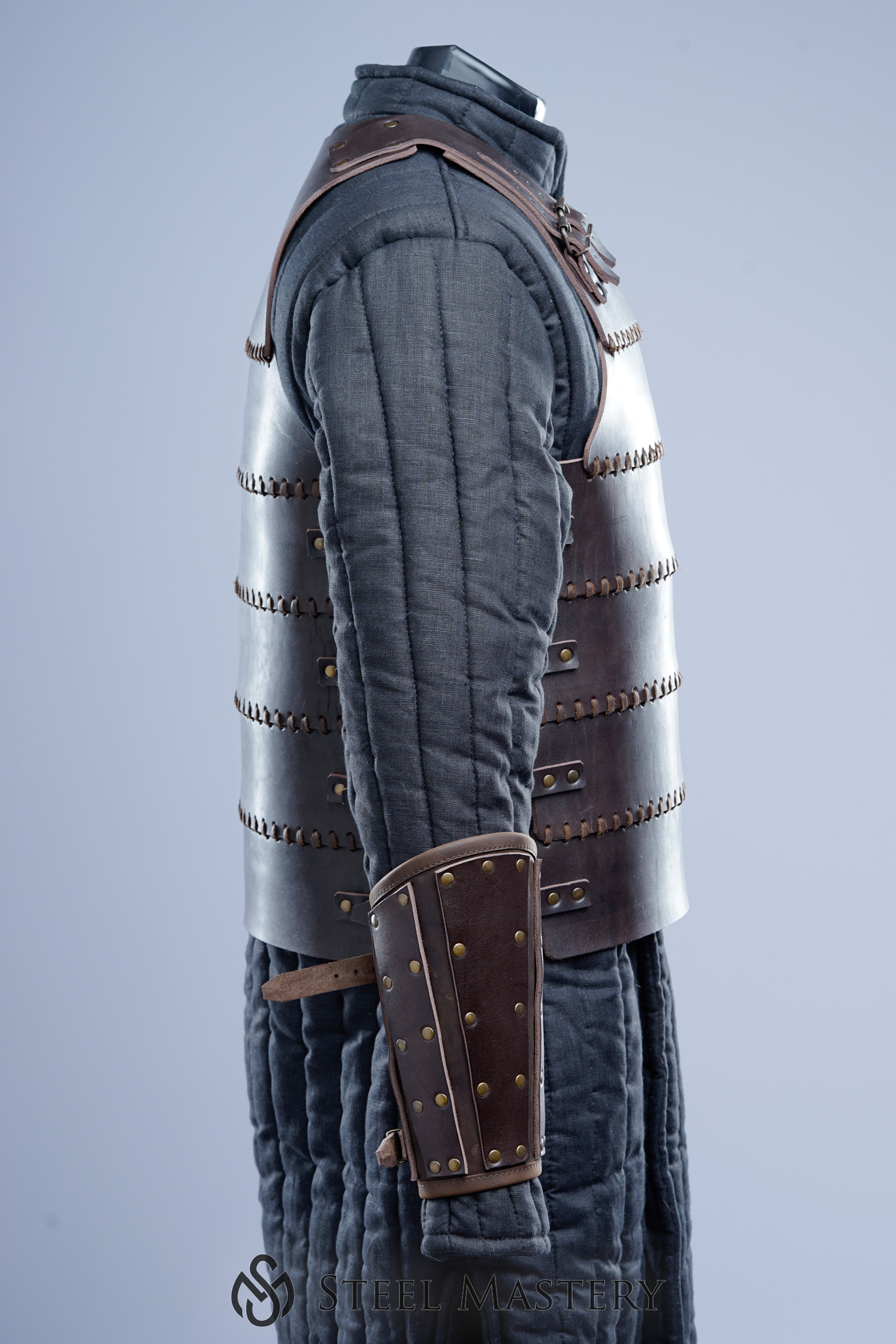 - Leather bracers. Arm protection is made of elastic leather. Long plates of croupon leather are riveted to the base. Belts with buckles are placed on the inner side of armor. Bracers may be purchased separately in our medieval shop.