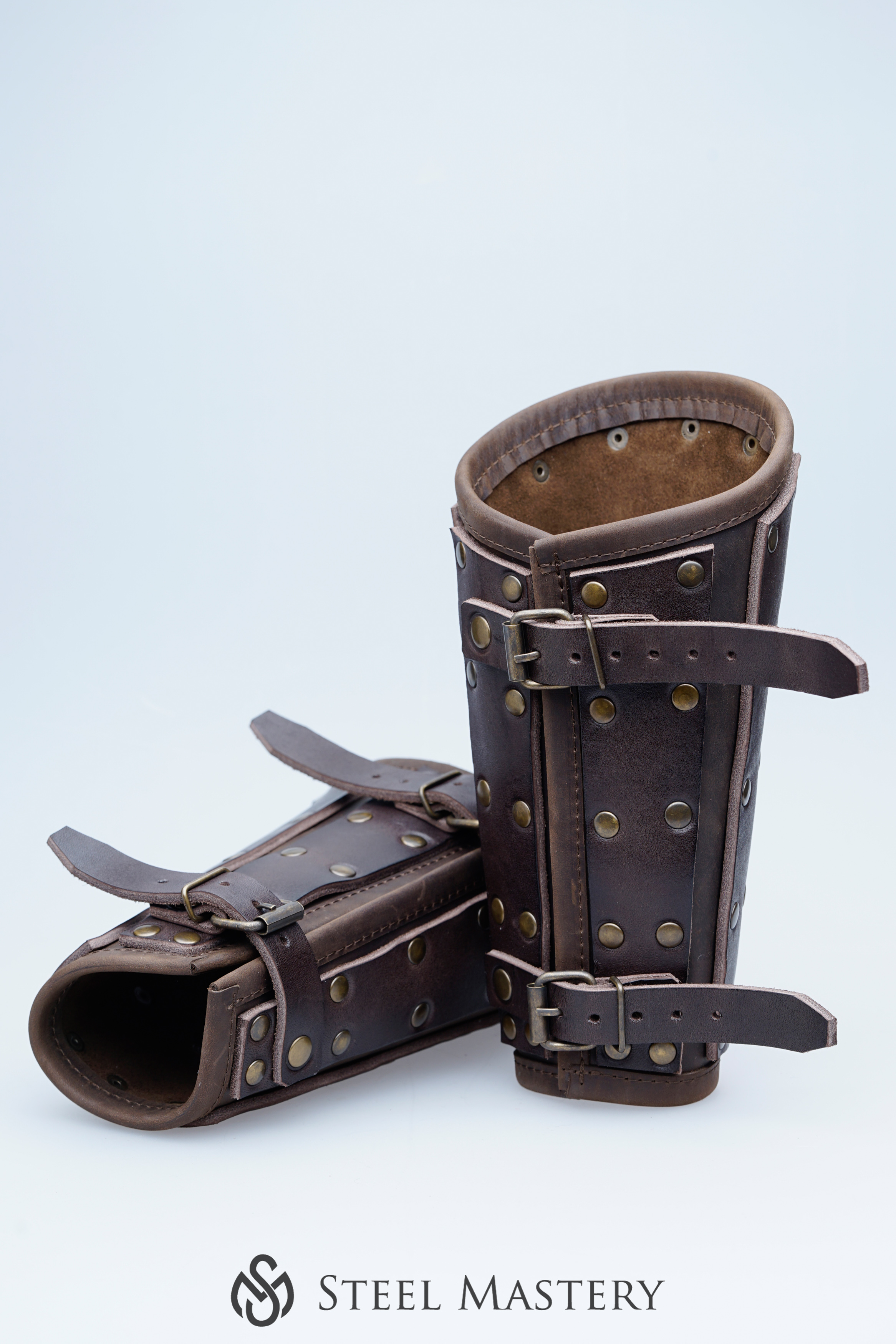 Long plates are made of firm croupon leather and riveted to the base. Belts on the inner side of bracers allow good fitting of protection.