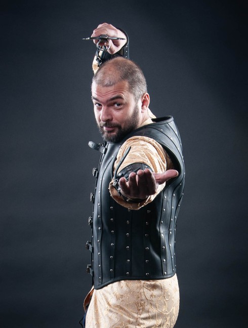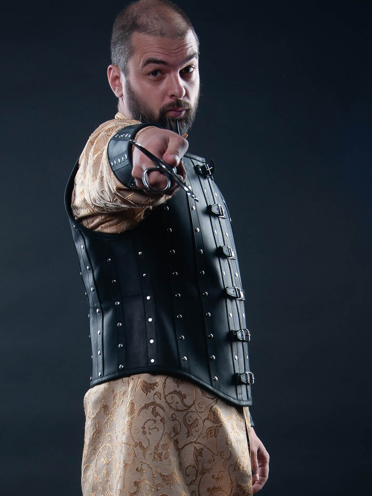 Just for that delicate pursuit of the noble Dons, Steel Mastery made this leather armor costume. Linen is too plain material, cotton is too soft, wool is too comfortable, silk is too sensitive and steel is too rough for such delicate issue. So, only leather, chaste black leather with plain drops of steel rivets is appropriate for medieval leather vest, in which one decides a point of honour.