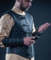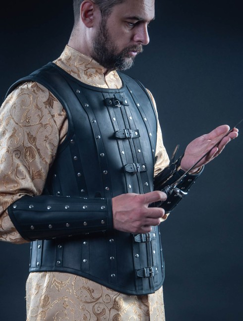 We took the best leather to create beauty, which you see in front of you. Black on black tells about seriousness of noble Don’s intentions. Decorative vertical leather straps add leather armor vest and bracers chastity and style, and simple steel rivets emphasize manhood and elegance of wearer. However, noble Don might have other occasions to wear leather vest and bracers – modern leather armor made by Steel Mastery.