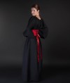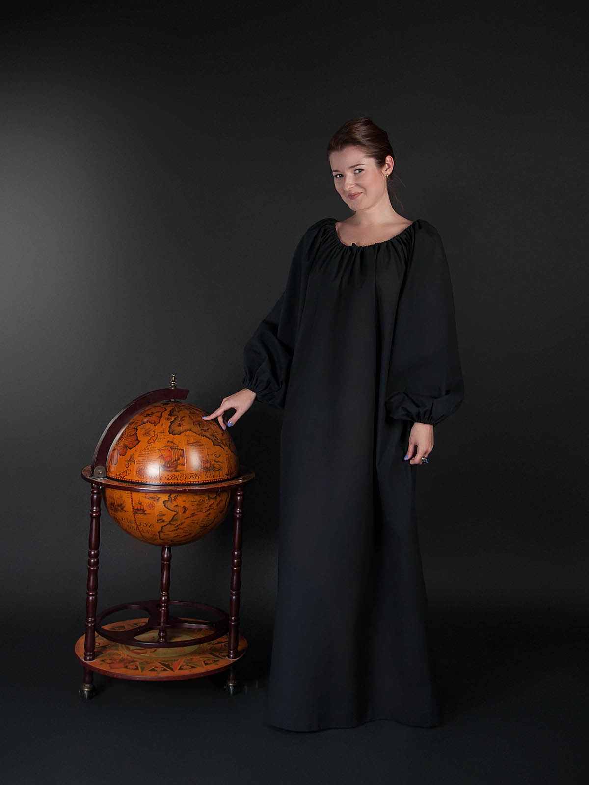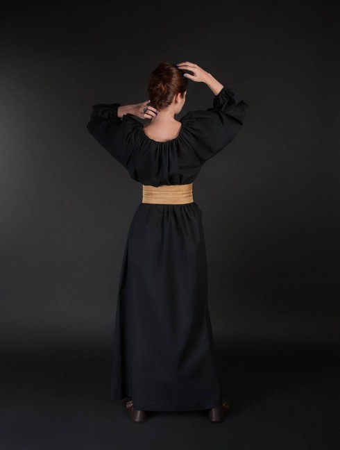 Thin cotton of hard structure is soft and smooth to the touch. By your wish, we may make this dress of linen or warm and comfortable wool. There is one of many of our medieval dresses for sale. And, instead of strict chic of black color, you may choose any rainbow dye, which will highlight your beauty and please your nice ladies caprice.